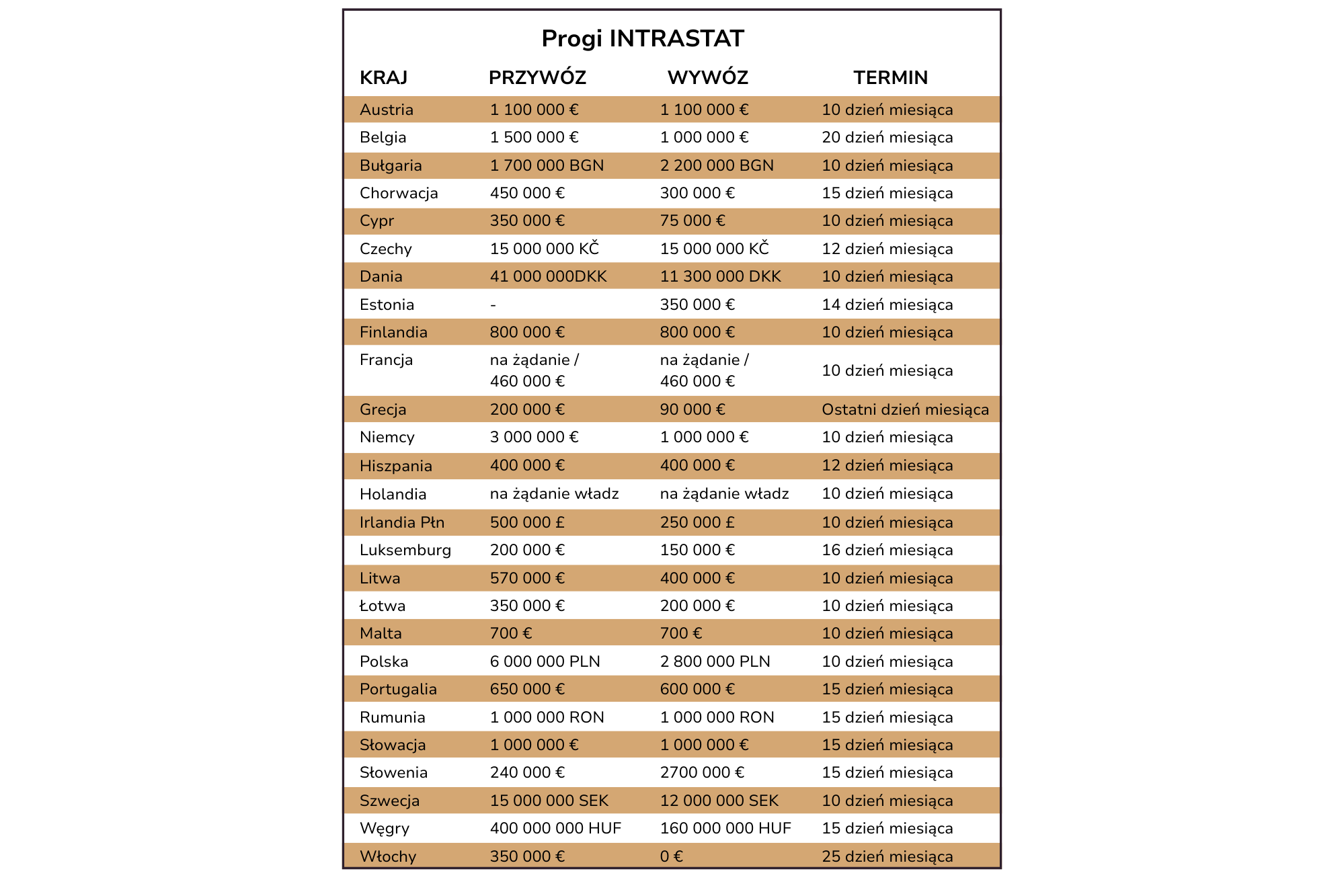 Każde państwo członkowskie samodzielnie ustala progi, po przekroczeniu których przedsiębiorcy muszą raportować do systemu Intrastat. Poniżej prezentujemy aktualne dane, które pomogą Ci zweryfikować, czy Twoja firma podlega już pod ten obowiązek w poszczególnych krajach, z którymi handlujesz. Pamiętaj, że brak zgłoszenia w terminie może wiązać się z dotkliwymi karami administracyjnymi.