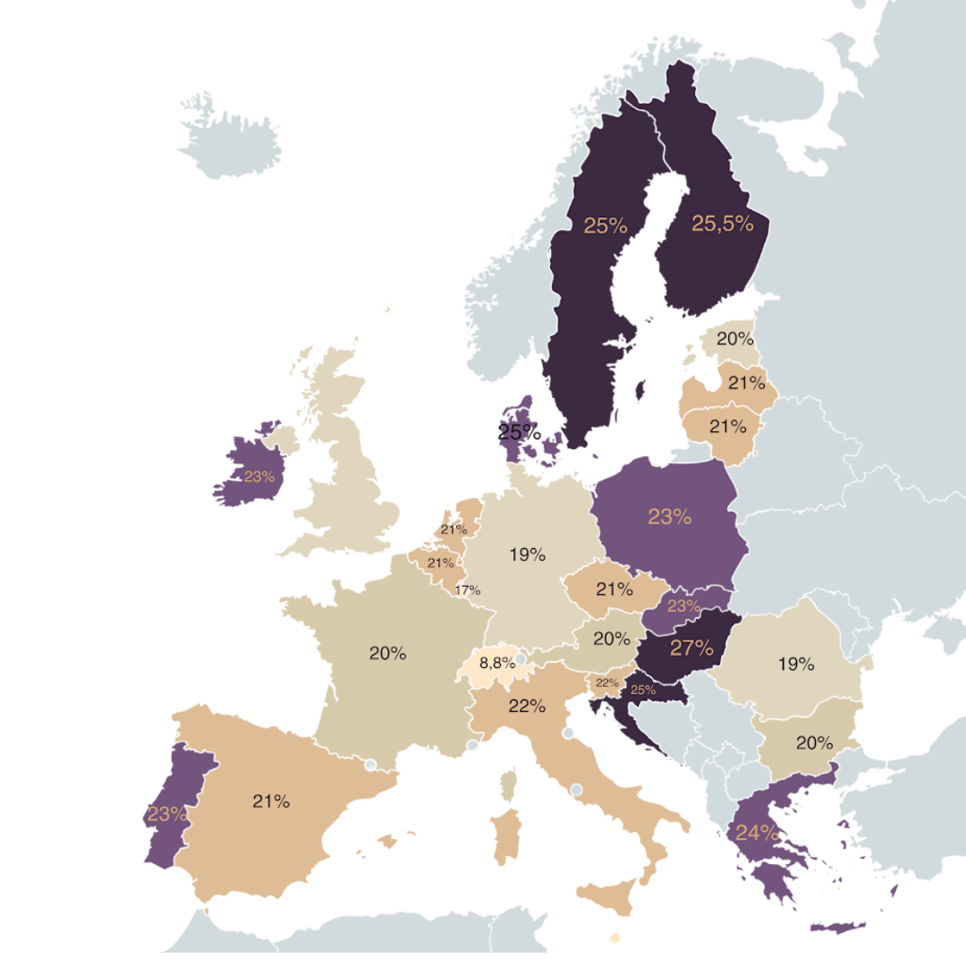 Planując politykę cenową na rynkach zagranicznych, musisz brać pod uwagę lokalne stawki podatku VAT. Różnice między krajami bywają znaczące – od 17% w Luksemburgu do aż 27% na Węgrzech. Ta wiedza jest niezbędna nie tylko do poprawnego wystawiania faktur, ale także do kalkulacji marży, jeśli sprzedajesz w modelu B2C (np. w ramach procedury VAT OSS). Poniższa mapa obrazuje zróżnicowanie stawek w Europie. Ciemniejsze obszary oznaczają kraje z wyższym obciążeniem podatkowym, co może być dla Ciebie sygnałem do odpowiedniego dostosowania strategii cenowej w danym regionie.